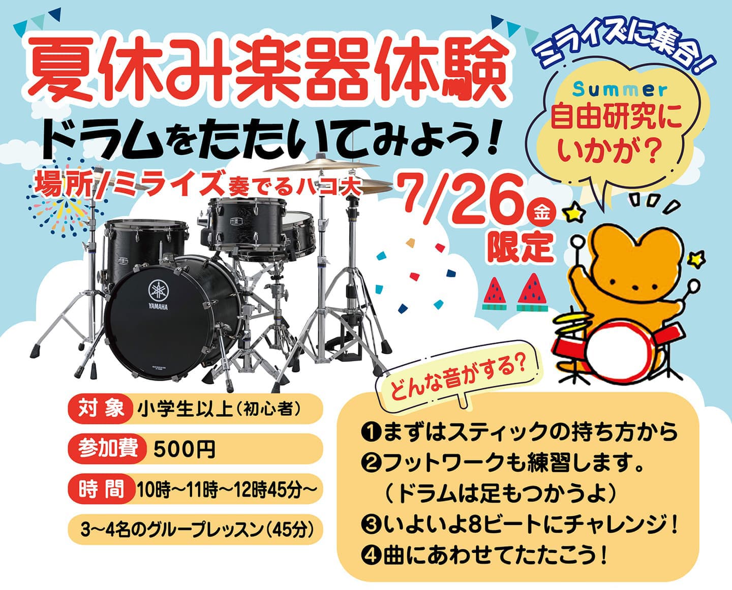 暑い暑い夏の1日、ミライズ奏でるハコで「ドラム体験レッスン」を行いました。