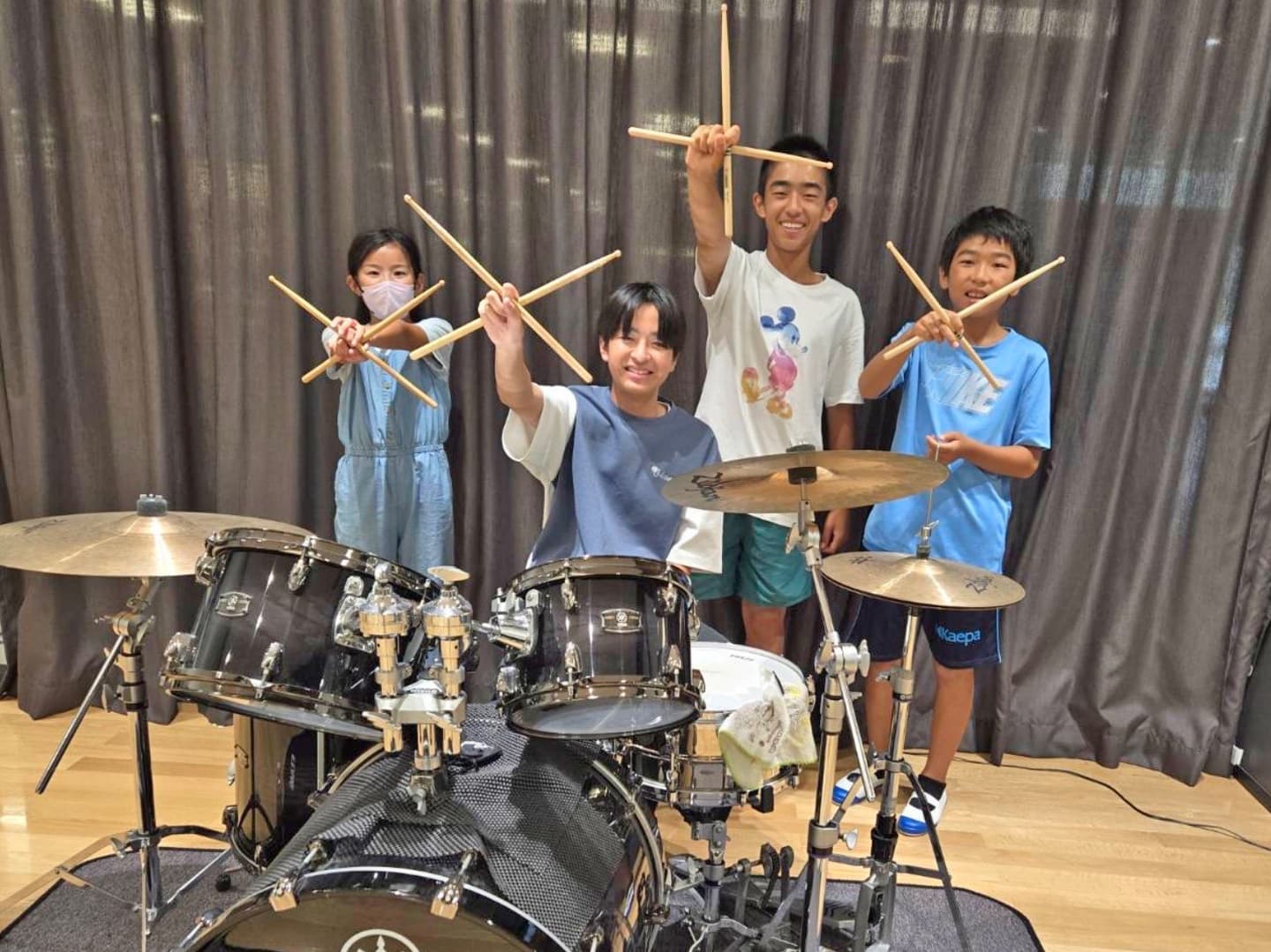 towa先生のカッコいい!!ドラム演奏をみんなで聴いたり、1人ずつワクワク しながら叩いてみたり、